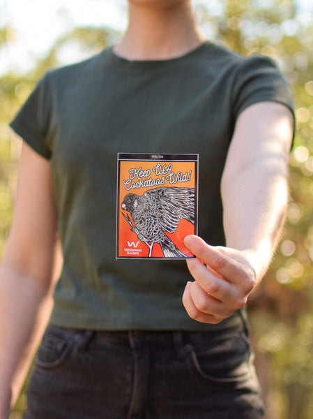 Merch that makes a difference. This outdoor vinyl sticker features a bold illustration of Carnaby’s black-cockatoo with the powerful call to ‘Keep WA Cockatoos Wild’—a tribute to one of the 11 threatened species at the centre of the Wilderness Society’s landmark Federal Court case.