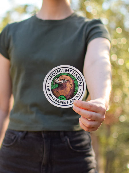 Merch that makes a difference. This outdoor vinyl sticker highlights the iconic Tasmanian wedge-tailed eagle and its powerful call to ‘Protect My Habitat’. This striking subspecies, found only in Lutruwita / Tasmania, is Australia’s largest bird of prey and one of 11 threatened species featured in the Wilderness Society’s landmark Federal Court case.