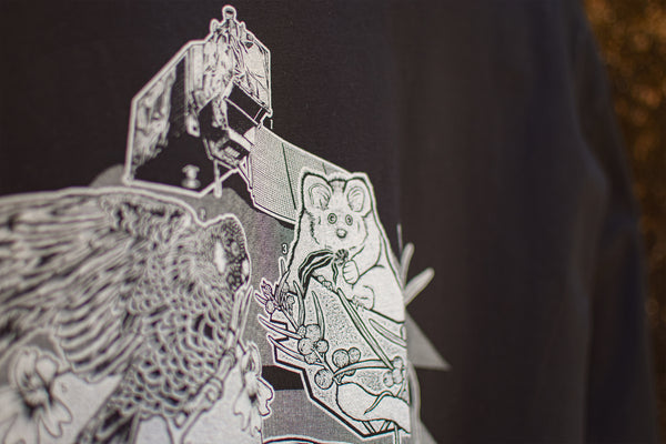 This organic t-shirt features artwork by George Levi, depicting Sentinel 2—the satellite technology used in the Watch on Nature platform—layered with map-style illustrations and threatened species inspired by real deforestation detection.